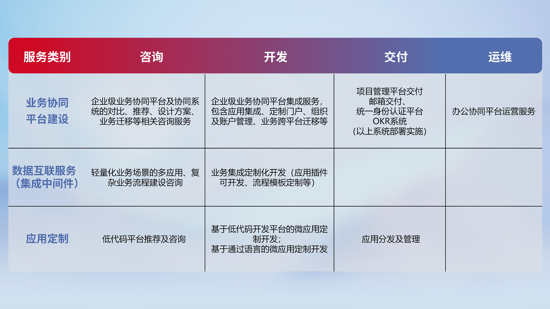 针对钉钉、、企微、、、、IDaas等平台级产品提供产品的规划、、、方案、、交付、、、、定制化开发等服务,,实现如统一协同办公、、智能客户服务、、混合会议管理、、智能数据查询、、等业务场景,,,,实现数字化转型。。。。